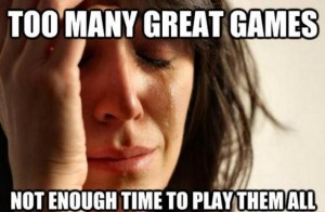 Samanlaisia tunteita on itselläkin. Joskus sitä toivoisi, että töistä irtisanottaisiin, jotta saisi lisää aikaa peleille. Vieläpä, jos loput n. 80 peliä toivelistalta hankkisi, niin päästäisiin Steam-kokoelmassani hienosti yli nelinumeroisen luvun… Onneksi en sentään omista kuin kaksi muuta konsolia, joille uusia pelejä ei oikeastaan enää julkaista.