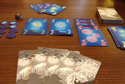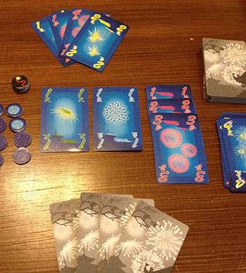 Hanabi on pirullisen vaikea peli, joka vaatii yllättävän paljon keskittymistä pelaajilta. Ihan jo se, että omia kortteja ei saa katsoa on ihan uskomattoman vaikeaa. Tuntuu, että korttia ei voi pinkasta nostaa sitä katsomatta! 😀 Jos kortit kuitenkin onnistuu saamaan käsiinsä oikein- eli väärinpäin niin pelissä riittää silti haasteita. Esimerkiksi, miten pelaajien tulisi ryhmänä keksiä, miten sopia pelitaktiikasta ilman, että oikeastaan sanoo yhtään mitään, sillä kaikki keskustelu toimii kuitenkin vinkkinä siitä, mitä toisilla pelaajilla on kädessä. Jos sanoo, että pelaajalla X ei ole mitään kriittistä kädessä, niin sehän kertoo, ettei hänellä ole ainakaan 5-kortteja kädessään. Sekin tuottaa ongelmia, että se mikä on itsestäänselvää toisille pelaajille ei todellakaan ole sitä korttien haltijalle. Hanabi on ainakin todistanut sen, että jokaisen ihmisen logiikka toimii ihan omia reittejään ja se, minkä piti olla itsestäänselvä vinkki pelaajalle tulkitaan lähes aina ihan päinvastoin kuin oli tarkoitus. Itku!