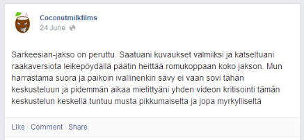 Youtuben puolella pieni joukko tuntee minut Coconutmilkfilms-nimellä. Olen tehnyt kyseiselle kanavalle nyt päälle puolen vuoden ajan Pelipohdinnat-sarjaa, jossa käsittelen erilaisia pelikulttuuriin ja pelialaan liittyviä aiheita innokkaan harrastajan näkökulmasta. Videoni muistuttavat hieman Jim Sterlingin, Totalbiscuitin, Campsterin tai Superbunnyhopin tuotantoa, mutta tietääkseni olen ainoa suomalainen kanava, joka tuottaa tällaista materiaalia.